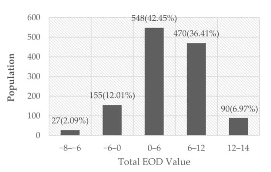 Residents with EOD accounted for 85.83% of the sample population. The proportion of polarized residents whose total EOD value was within the range of −8 to 6 or 12 to 14 was no more than 10% (Figure 2). The samples’ average total EOD risk was 51.17%, indicating that EOD behavior occurred 5 out of 10 times.