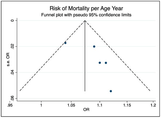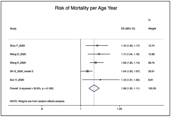 | Wang, K. 2020 [20] | Hypertension, fever In meta-analysis: yes Number of age-dependent risk factors for meta-regression: 1 (hypertension) | Logistic regression Cases = 22 (7.2%) Non-cases = 283 (92.8%) | Association between age (per yr.) and mortality: Adj. OR: 1.09, 95% CI (1.054−1.14) |