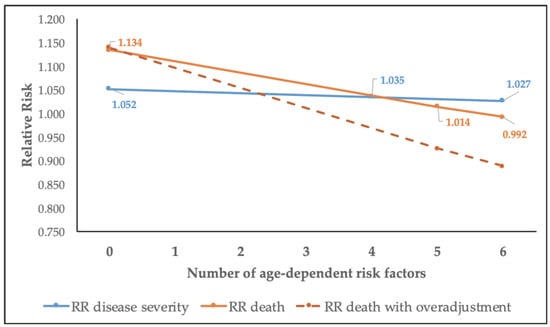 | Number of Age-Related Risk Factors | RRage Disease Severity † | RRage Death ‡ |
