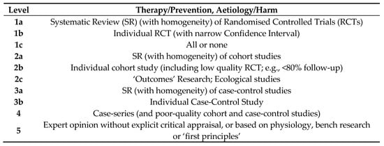- OCEBM Levels of Evidence Working Group. “The Oxford 2009 Levels of Evidence”. Oxford Center for Evidence-Based Medicine. Available online: https://www.cebm.net/index.aspx?o=5653 (accessed on 10 August 2020).