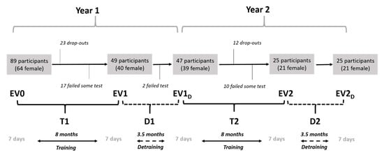 Experimental procedure and flow chart. T1 and T2: first and second training periods (8 months each). D1 and D2: first and second detraining periods (3.5 months each). EV0, EV1, EV1D, EV2, EV2D: pre-post training and detraining assessments (one week each). Upper lines and call texts describe the participants flow, from the initial 89 to the final 25 who completed the whole testing along the two years (from EV0 to EV2D).