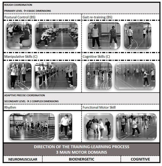 The EFAM-UV© program [] is a MCcogTP aiming to improve cognitive, neuromuscular and cardiovascular capacities under a complex approach. On the basis of gait-retraining and improving postural control, enriched environments and continuous changes in constraints facilitate combining strength and cardiovascular proposals under the dual-tasking methodology, increasing intensities and task difficulty, concurrently through the three main motor domains (Figure 2) []. In order to increase functionality, this MCcogTP includes many tasks related to daily living activities (sitting to standing, asymmetric handling and transporting of light-weights, etc.).