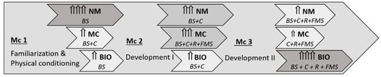EFAM-UV© periodization. Guidelines of the 3 main mesocycles (Mc) in the 8-months macrocycles used in this study. Horizontal arrows represent the changes in the motor domain and contents’ orientation (NM: neuromuscular; MC: motor control; BIO: bioenergetic), with the length pointing out its beginning and end during the mesocycle. It includes the dimensions to develop in each of them (BS: basic skills; C: complementary skills; R: rhythm; FMS: functional motor skills). The vertical small arrows (and colours) reflect the prevalence and importance of each motor domain.