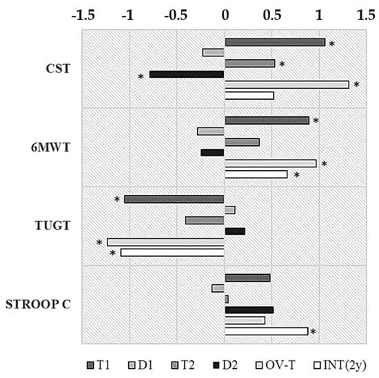 Effect size for the training and detraining changes along two years in EFAM-UV©. T1: changes following the first 8 months of training (EV0 vs. EV1); D1: changes after 3.5 months of detraining (EV1 vs. EV1D); T2: changes following the second 8 months of training (EV1D vs. EV2); D2: changes after the second 3.5 months of detraining (EV2 vs. EV2D). OV-T: Overall changes after two years of training (EV0 vs. EV2); INT-2y: Changes over the two years of intervention, including two training and two detraining periods (EV0 vs. EV2D). * p < 0.05. CST: chair stand test, repetitions; TUGT: time up-and-go test, seconds; 6MWT: 6 minute-walking test, meters; STROOPT: stroop test, arbitrary units.