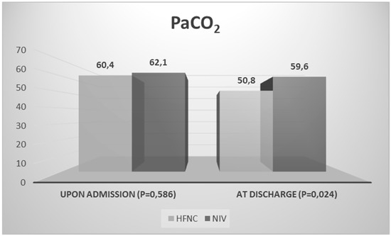 At discharge from hospital, RR decrease was statistically significant in both groups (A: from 21.3 ± 8.7 to 15.7 ± 3.5, mean difference = −5.6, 95% CI, −8.3, −2.9, p = 0.0111 vs. B: from 26.6 ± 5.3 to 17.3 ± 4.6, mean difference = −9.3, 95% CI, −7.8, −3.4, p = 0.0001, breaths per minute). Instead, HR decrease was statistically significant only in NIV group (B: 88.0 ± 17.1 vs. 74.5 ± 11.4, mean difference = −13.5, 95% CI, −19.8, −7.3, p = 0.0452, beats per minute). Statistically, the mean value of PaCO2 in the intervention group was significantly lower in comparison with the control group (A: 50.8 ± 9.4 mmHg vs. B: 59.6 ± 13.9, mean difference = −8.8, 95% CI, −13.9, −3.7, p = 0.024). Although PaCO2 on admission and at discharge decreased more in the HFNC group than in the NIV group, the difference was not statistically significant (A: from 60.4 ± 9.9 to 50.8 ± 9.4 mmHg vs. B: from 62.1 ± 10.3 to 59.6 ± 13,9 mmHg, p = 0.080) (Figure 1). According to the analysis of variance for repeated measures, no statistically significant difference was observed between PaCO2 and age (p = 0.080), gender (p = 0.434), BMI (p = 0.454), prior NIV in their residencies (p = 0.220), days of hospitalization (p = 0.960), duration of either NIV or HFNC use (p = 0.991), change from NIV to HFNC (p = 0.608), or in which group patients were initially randomized (p = 0.080).