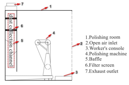 Figure 1 shows a view of the polishing chamber. Field investigations were conducted in the operator area where the polishing machine was polishing. Originally, the polishing machine was equipped with a dust collector channel (Figure 1). However, its dust removal performance was very poor. The designed cross section of the system had a 2.75 m width and 2.3 m height. The polishing chamber had an open inlet, a strip inlet at the bottom of the dust collecting channel, and an exhaust fan at the outlet of the dust collecting channel. Preliminary analysis showed that this ventilation arrangement may be the main reason for the failure of the dust collector.