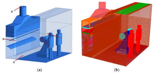 The finite volume method, implemented in Fluent, was used to convert Equations (1) and (2) into a discretized algebraic equation form. Thus, by using iterative numerical algorithms, the physical variables of the airflow field at discrete points or volumes could be determined.