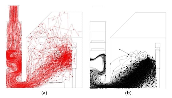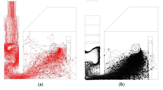 Particle trajectories colored by particle size in existing system. (a)Particle diameter smaller than 10 μm. (b) Particle diameter larger than 10 μm.