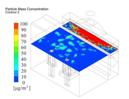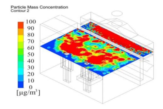 The distribution of dust mass concentration could more quantitatively indicate the performance of the new system. Dust concentration distribution 1.5 m above the floor was shown in Figure 13. According to the concentration distribution of the results of the current model shown in Figure 7, the maximum dust concentration was set at 100 μg/m3. Compared with the original system, the new system has obvious dust mitigation effect. The dust concentration was below 50 μg/m3 in workers’ breathing area. The dust concentration was relatively lower around the workers, which could provide a healthier working environment for the operator. The results showed that the system can collect more than 95% of fine dust particles.