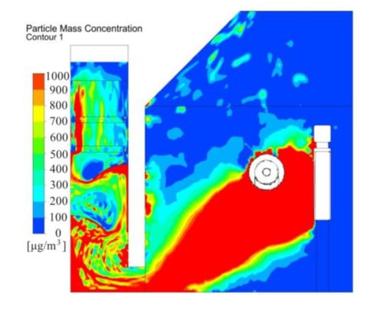 Figure 8 depicts dust concentration across the polishing wheel center. During polishing process, the dust concentration distribution was non-uniform. The dust concentration in the dust collection channel was higher than 1000 μg/m3. The velocity vectors shown in Figure 6 could clearly illustrate the distribution law of dust. Figure 6 shows that as the air entered the operating area from outside to the air suction inlet, it blew most of the dust to the dust collection channel, causing significant dust accumulation, which was relatively high near the baffle. The airflow generated vortices at the baffle, and fine particles followed the airflow and gathered at the baffle. Dust particles tended to accumulate in the zones under the baffle. Dust concentration gradually dropped in the air filter and decreased further in the exit flow. However, the average concentration remained high and varied between 400 and 600 μg/m3. Therefore, spray system nozzles installed at the bottom of the dust collection channel, which formed a mist covered the dust sources and encouraged dust settling.