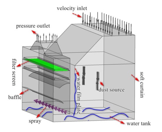 Domestic researchers have been working on various dust control measures. Based on a polishing machine’s processing features and dust characteristics, Yu et al. (2013) performed computational fluid dynamics (CFD) simulations and optimized the structural design using the results. Suction hoods were designed based on experience and tests of the flow field smoothness []. Chen studied the movement and deposition of aluminum dust in a dust collection pipeline, found the most suitable airflow velocity for the dust deposition interval and transport, and provided guidance for the optimization of the wind speed of the dust removal system []. The influencing factors of the aluminum dust deposition in a dust collection pipeline were examined to avoid the explosion concentration. Hua et al., analyzed a ventilation dust removal system and found that there are many potential safety hazards in the design, operation, and maintenance processes []. All these studies indicated that dry dust collection systems usually use ventilated dust removal technology, which has the disadvantages of complicated dust collection pipelines, easy formation of blockages, high energy consumption, and large potential safety hazards. By contrast, wet dust removal system can effectively reduce the risk of dust explosions.
