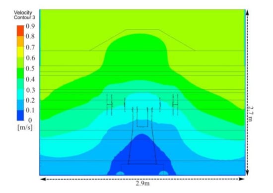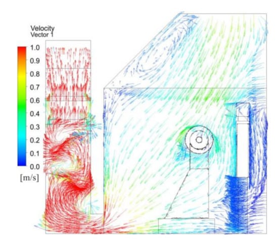 Figure 10 shows the velocity contours in front of the polishing wheel. As a result of the new ventilation system, air flow patterns changed significantly. Compared with the original flow field shown in Figure 4, by adding an FFU at the upper side of the operator area, an effective air supply and suction system was formed. In the side area of the polishing machine, the airflow velocity decreased from the top to the bottom. Moreover, air velocity in the operating area was improved to 0.5 m/s, which effectively controlled the dust transport, preventing dusty air from dispersing into working area and environment.