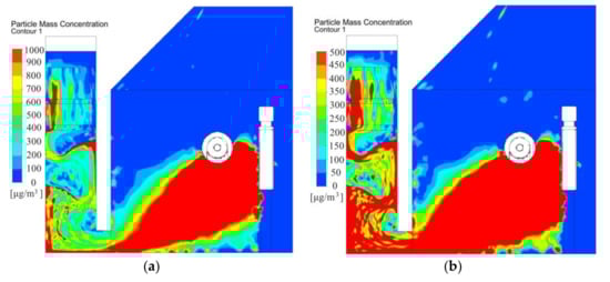 The dust concentration distribution across the center of the polishing wheel is illustrated in Figure 14. Dust generated from the polishing face was forced to flow toward the exhaust side. Compared with the basic model shown in Figure 9, the same maximum dust concentration was set at 1000 μg/m3 in Figure 14a. The results showed that the dust concentration in the collection channel decreased further with new system. However, when the maximum dust concentration was set at 500 μg/m3 in Figure 14b, the dust concentration was higher (above 500 μg/m3) under the baffle. This was mainly caused by the poor performance of the dust collection channel. Therefore, this analysis can be used to determine the optimal arrangement of the spray dust-settling equipment on site, which can greatly improve the effect of spray dust removal.