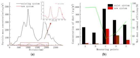 Evolution of dust concentration and dust removal rate before and after application of integrated dust control system. (a) Investigation line 1.5 m above the floor. (b) Measurement points in polishing chamber.