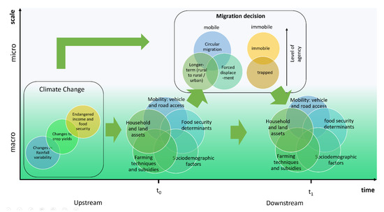 Migration itself may occur over a range of spatial scales—from movements between rural and urban areas, to international migration—as well as a range of temporal scales such as short-term migration, circular migration, to permanent moves. The decision of each individual to migrate may also carry different levels of human agency. The decision to migrate is due to an aggregation of micro-level (typically household or individual) and macro-level (societal) drivers. As such, each potential migrant has their own unique profile of factors and drivers. Such individualistic situations are often described in terms of the individual’s or community’s vulnerability [18,19,20]. This presents a key challenge in many existing studies, which struggle to reconcile drivers at the macro- and micro-demographic scales.