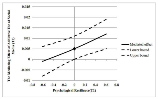 The mediating effect of addictive use of social media (T2) at different levels of psychological resilience (T1).