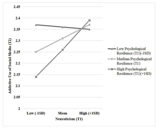 Psychological resilience plays a moderating role in the relationship between neuroticism and the addictive use of social media. The improvement of psychological resilience does not reduce the risk of addictive social media use of high neurotic individuals. However, it protects the low neuroticism ones. Namely, with the improvement of psychological resilience, low neuroticism individuals reduce their addictive use of social media significantly. This also suggests that in addition to the buffering effect (reducing the risk of high-risk individuals), there is also an increasing effect (making low-risk individuals perform better) of psychological resilience, which echoes the current research results [57]. Our results show that low neurotic individuals likewise have a risk of addictive use of social media if their psychological resilience level is not high.