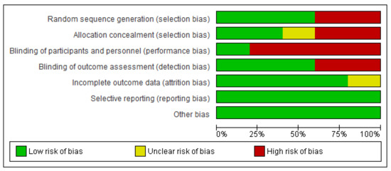 Risk of bias summary. The green color indicates low risk of bias, yellow color indicates unclear risk of bias and red color indicates high risk of bias.
