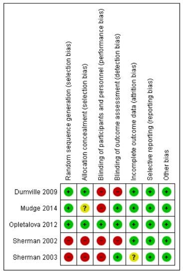 None of the studies reported significant serious adverse effects during the MT. Three studies used the visual analog scale for pain, two of which [18,19] reported pain as a significant side effect of the MT, while one study did not [12]. Dumville et al. [18] described that patients had experienced significantly more pain in the previous 24 h at the removal of the first debridement treatment, while Mudge et al. [19] found more ulcer-related pain or discomfort in the MT group. In the other two studies [16,17], two patients complained of mild pain during MT, but the same patients had similar pain during the conventional treatment. No tool was specified for the assessment of pain in two studies [15,16].