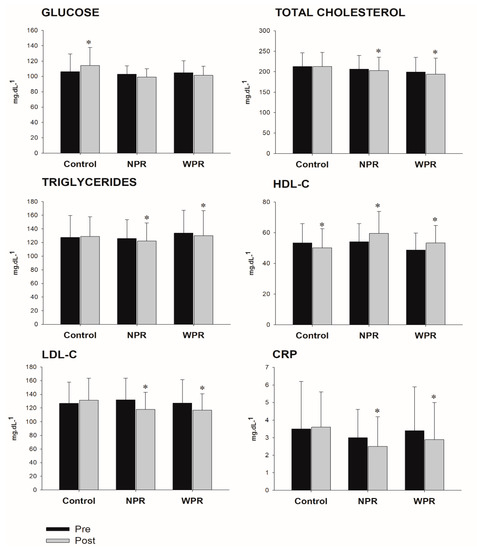 Blood markers at pre- and post-intervention according to groups. NPR = narrow repetition-zone pyramid training; WPR = wide repetition-zone pyramid training; HDL-C = high-density lipoprotein; LDL-C = low-density lipoprotein; CRP = high-sensitivity C-reactive protein. * p < 0.05 vs. pre.