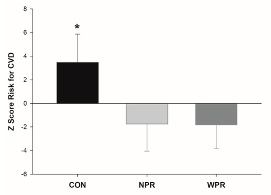 Composite Z-score of the percentage changes from pre- to post-training of the cardiovascular disease (CVD) risk according to groups in older women. CON = control group; NPR = narrow repetition-zone pyramid training; WPR = wide repetition-zone pyramid training; * p < 0.05 vs. NPR and WPR.