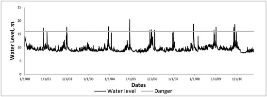Therefore, in this research, our analysis focuses on water levels in the Kelantan River. The daily water level data of Kelantan River recorded at the Guillemard Bridge station (measured in meters, m) were obtained from the DID. The DID has assigned a water level of 16 m as the danger of the Kelantan River at the Guillemard Bridge station as an indicator of a flood. Figure 1 shows a time series plot of the daily water level data of the Kelantan River obtained from 1 January 2000 until 13 October 2010. Some important statistical parameters of the time series are shown in Table 1. Table 2 lists the dates in which the water level data exceeded the danger level (16 m); these dates will be used as benchmark dates for flood events.
