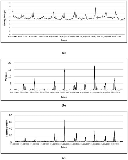Time series of moving average and critical slowing down (CSD) indicators: (a) the time series of twenty days’ moving average of the water level data of Kelantan River; (b) the variance of the water level data of Kelantan River; (c) the average spectral density at low frequencies of the water level data of Kelantan River.