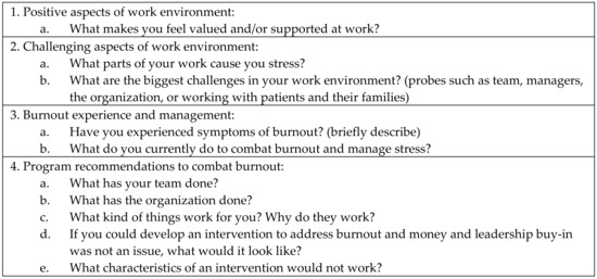 The associated University Institutional Review Board approved all research procedures prior to the study execution [STUDY00003263]. The researchers contacted employees from a large Midwestern hospice organization via email to query their interest relative to participating in the focus group study. Of 96 employees who volunteered, 23 were selected for participation balancing length of time employed at the hospice organization, role, and geographic area to ensure a representative sample of participants with an aim of four participants per group. Mini focus groups (less than five participants) are used when group participation may be challenging to obtain, but is necessary for the type of discussion and engagement needed [20]. Those who agreed to participate completed an on-line consent form. Pre-session planning and content for the focus groups was developed consistent with study aims and was approved by a panel of researchers, practitioners and staff from the hospice research team [17,20]. All focus groups sessions were held via video conferencing over a 90-min period across a 4-week period (October 2019–November 2019) and were audio recorded, a method that our team had already tested in previous research [21]. Established focus group rules were discussed including confidentiality, use of first names, and equal opportunity to communicate viewpoints. Focus groups questions were standardized across groups and elicited content about positive and challenging aspects of the work environment, perceptions of burnout, strategies to manage work stressors, and recommendations for organizational management (see Figure 1). Participants were compensated with a $40.00 Amazon gift card in appreciation of their service and time.