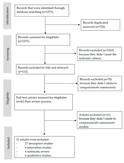 A total of 1975 articles were identified by databases searching. A total of 1863 were excluded because they were duplicated (n = 720) or because they did not match eligibility criteria (n = 1143). A total of 112 articles were retrieved but 70 articles were excluded by title and abstract because they were considered not related to CCC models by the three reviewers. This resulted in 42 full-text articles. A total of 11 articles were excluded by reviewers in a discussion session because they did not offer relevant information. We obtained 31 articles for the final analysis. Figure 1 represents the selection process.