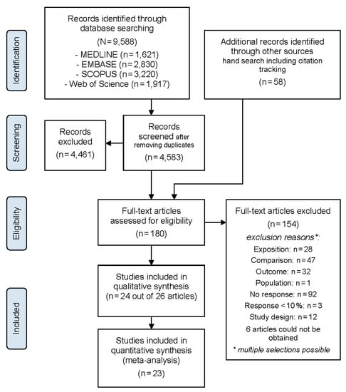 The database search found 4583 unique references (9588 with duplication). Title and abstract screening, citation tracking, and the reference list search identified 180 studies for the full text screening. We included 24 studies published (in 26 publications) between 1977 and 2019 [44,48,49,50,51,52,53,54,55,56,57,58,59,60,61,62,63,64,65,66,67,68,69,70,71,72]. Despite extensive searching, we were unable to obtain the complete text of six publications through our library and excluded 148 studies. The literature selection process is summarized in Figure 1.