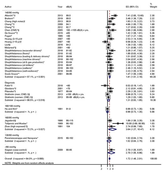 Of the remaining hypertension definitions used, the only threshold that was used by more than two studies was that of 160 mmHg systolic and/or 95 mmHg diastolic blood pressure. This definition resulted in the highest pooled risk, but it should be noted that the effect sizes for this group also represented higher noise exposures above 90 dB(A) and there was considerable heterogeneity (I2 = 72.2%).