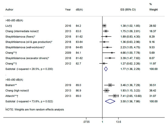 For example, Chang et al. [44] found an adjusted PR of 4.66 (converted from OR) for noise exposures exceeding 80 dB(A). The average noise exposure in the exposed group was 84.1 dB(A), and the exposed workers worked for an average of 7.4 years. Based on Formula (1), this corresponds to a LEX,40y of 76.77 dB(A). The average noise exposure in the comparison group was 72.8 dB(A) for an average of 7.6 years, which yields an LEX,40y of 65.60 dB(A). These values and the PR of 4.66 were converted to the increased risk per 10 dB(A) LEX,40y using Formula (2). This resulted in an effect estimate of 3.98 per 10 dB(A) LEX,40y. This effect estimate was pooled in a further meta-analysis. The upper and lower limits of the confidence interval were converted using the same formula, which sometimes resulted in asymmetrical confidence intervals.