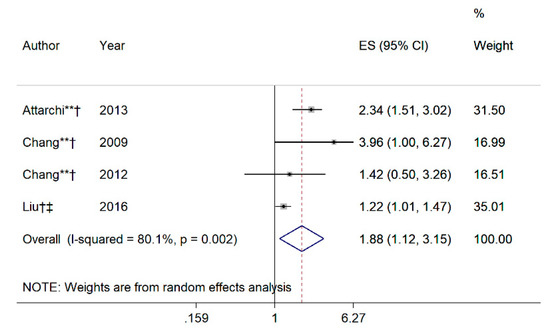 - Harris, R.; Bradburn, M.; Deeks, J.; Harbord, R.; Altman, D.; Sterne, J. Metan: Fixed- and random-effects meta-analysis. Stata J. 2008, 8, 3–28. [Google Scholar] [CrossRef]