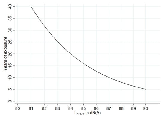 where LpAeq,Te is the average sound level in dB(A), is the exposure time in years, and is the reference working life ( 40 years). Using this formula, LEX,40y is equal to 90 dB(A) after 40 years of exposure to 90 dB(A) and approximately 87 dB(A) after 20 years of exposure to 90 dB(A), because 3 dB(A) represents a doubling in noise energy exposure.