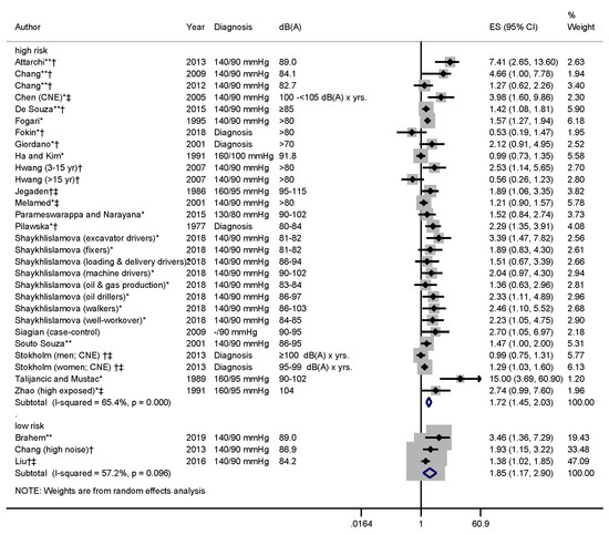 We also stratified the results according to risk of bias while disregarding differing definitions of hypertension (Figure 6). All three studies with an overall low risk of bias used the 140/90 mmHg definition of hypertension, and their pooled effect estimate was 1.85 (95% CI 1.17–2.90, I2 = 57.2%) for occupational noise exposures exceeding 80 dB(A). In comparison, the pooled estimate for studies with an overall high risk of bias was lower (1.72; 95% CI 1.45–2.03), heterogeneity greater (I2 = 65.4%), and these studies applied different definitions of hypertension.