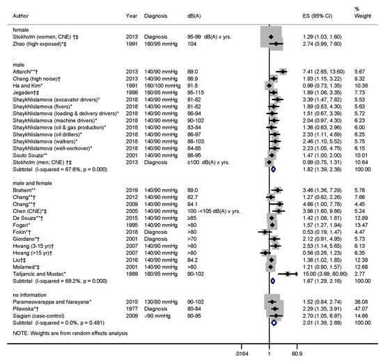 The stratification according to sex of the study population is shown in Figure 7. This analysis showed comparable risk increases for worker populations including only men (ES = 1.82; 95% CI 1.39–2.38; I2 = 67.6%) and those including both men and women (ES = 1.67; 95% CI 1.29–2.16; I2 = 69.2%). Only two studies provided risk estimates for women. Only Zhao et al. [72] included only women and Stokholm et al. [69] reported results that were stratified by sex. Both of these studies indicate an increased risk of hypertension among women exposed to occupational noise, although the Zhao study just failed to reach statistical significance. We refrained from pooling the results for women due to the low number of studies and the use of different hypertension definitions by these two studies.