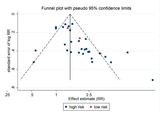 A funnel plot of the effect estimates used in the main analysis (Figure 2) showed an asymmetrical distribution of the effect estimates (Figure 8). The statistically significant Egger’s Test (p = 0.001) also indicated small-study effects. We used the "trim and fill" method (using metatrim) to determine what the pooled effect would have been if the “missing” study results were available in order to gauge the potential impact of publication bias on the pooled results. According to this method, the pooled RR (random-effects) would still be significant if the funnel plot were symmetrical (corrected RR = 1.40; 95% CI 1.23–1.60).
