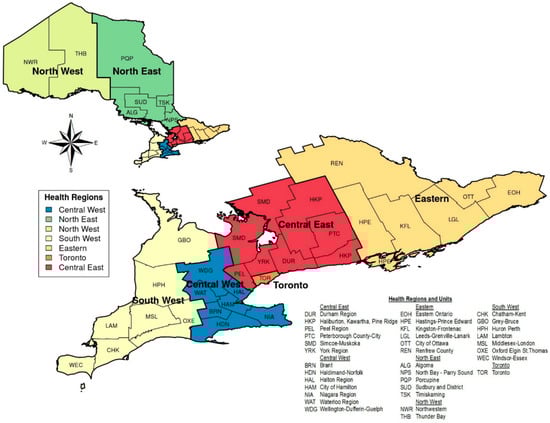 Public health regions and the corresponding public health units in Ontario; Source: Map created using Public Health Ontario boundary files [97].