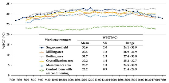 The WBGT in the hottest month of the harvesting season is shown in Figure 1. The mean WBGT in the sugarcane fields (measured from 07:30 to 17:30) was 30.6 ± 2.0 °C with a range of 24.1–33.9 °C. The WBGT in the field was low in the morning, then continuously increased until noon, remaining stable (WBGT > 30 °C) in the afternoon period and then decreasing after 15:30 p.m. For the factory, all ranges of WBGT in each workplace (measured from 08:00 to 17:00) were narrower than those of the sugarcane field. The highest mean WBGT was 31.7 ± 1.3 °C with a range of 27.4–33.8 °C in the boiling area; followed by crystallization area (30.2 ± 1.4 °C), milling area (29.5 ± 1.2 °C) and maintenance area (28.7 ± 1.3 °C). The lowest mean WBGT was 23.2 ± 0.9 °C in the control room with air conditioners.