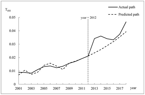 Actual and predicted paths of the THH index from 2001 to 2018.