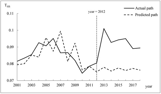 As shown in Figure 2, the actual value of THH increased more than the predicted value after 2012, and the fluctuation was more obvious, thereby indicating that the WEC launched in the Xin’an River basin in 2012 increased the regional economic difference between Huangshan City and Hangzhou City. In particular, during 2013, 2014, 2015, 2016, 2017, and 2018, the actual THH values increased by 45.56%, 38.90%, 18.04%, 4.15%, 5.67%, and 18.72%, respectively, compared with the predictions. Thus, the WEC policy significantly widened the economic gap between the two regions during the first pilot period (2012–2014). However, the difference between the actual value () and the predicted value () decreased significantly after the second pilot (2015–2017). Therefore, the impact of the WEC policy intervention on the economic difference between Huangshan and Hangzhou gradually decreased but with a rebound in 2018.