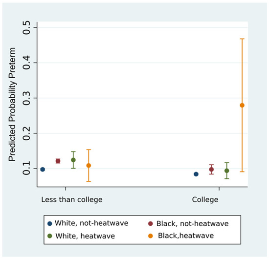 Using post-estimation tools in Stata, we found that births to Black women with college degrees exposed to heat waves show a higher relative risk of PTB compared to births to White women with college degrees in a heat wave (2.97 RR 1.45–6.07 95% CI).