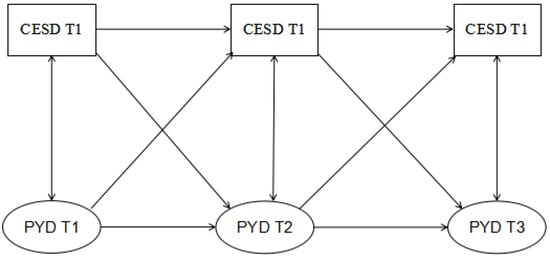 The hypothesized full longitudinal cross-lagged model. Cross-lagged relationship between positive youth development (PYD) and depressive symptoms across three waves; T1, Time 1 (first year); T2, Time 2 (second year), T3, Time 3 (third year).