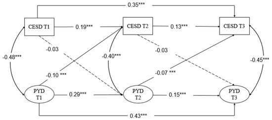 Cross-lagged relationship between positive youth development (PYD) and depressive symptoms across three waves. T1, Time 1 (first year); T2, Time 2 (second year); T3, Time 3 (third year). Note. *** p < 0.001.
