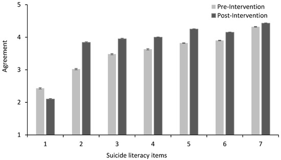 Estimated marginal means for suicide literacy pre- and post-intervention. Note. Error bars represent standard errors. On the x-axis, 1 = “Asking a workmate if they are having suicidal thoughts can increase his/her risk of suicide”, 2 = “People considering suicide often send out warning signs or invitations”, 3 = “Suicide is a serious problem in the energy industry”, 4 = “If I was struggling with mental health issues, I would be willing to ask for help”, 5 = “If I was struggling with mental health issues I would know who I would talk to, in order to get help”, 6 = “I would notice if a workmate was having a tough time and ask how he/she was doing”, 7 = “If I knew a workmate was struggling then I would be willing to offer help”.