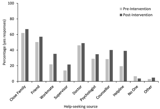 Percentages of help-seeking intentions by source (yes responses) pre- and post-intervention.