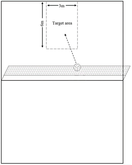 The spike-specific performance test was undertaken on a standard volleyball court (9 m × 18 m) and the net height was set for female volleyball players (2.24 m) [27]. As part of the assessment, participants were instructed to spike the ball at a target of 6 m × 3 m dimension (Figure 1). The participants were allowed five attempts, and each attempt was scored with a dichotomous parameter of “successful” or “unsuccessful”. The participants were not provided with extra attempts, irrespective of the quality of each set. The ball speed for each spike was also measured with a speed gun (Stalker ATS II, Texas, USA), at a sampling rate of 100 Hz. The same setter passed the ball to the participant to ensure standardization across each trial. According to a previous study [27], this spike-specific performance protocol has been reported with excellent reliability in a similar cohort of female volleyball players.