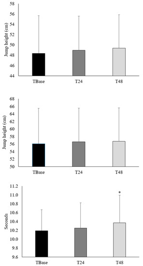 The sport-specific performance measures for countermovement jump (top), run-up vertical jump (middle), and T-agility performance protocol (bottom) between baseline (TBase) and 24 h post resistance training (RT) (T24) above the bar, between TBase and 48 h post RT (T48) above the bar, and between T24 and T48 in-between the bars. * Significantly different from TBase (p < 0.05).