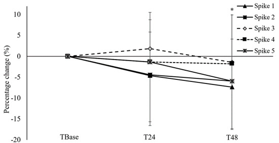 The percentage change in ball speed during the spiking performance test at 24 h (T24) and 48 h (T48) following the RT bout. * Significantly less than TBase as a main effect between days (p < 0.05).