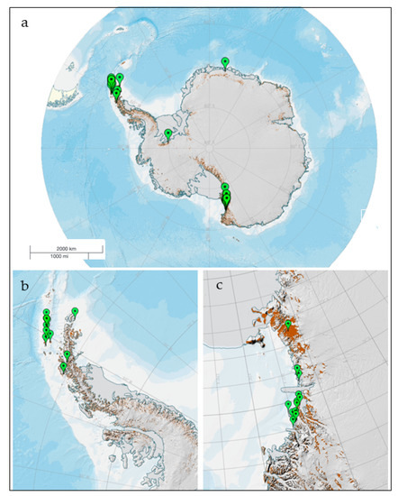 Antarctica is characterized by the coldest and driest climate known on Earth. Within this environment, the Antarctic Peninsula and the adjacent islands (maritime Antarctica) have a cold maritime climate, with mean monthly temperatures from 0 to less than −15 °C, and annual precipitations from 350 to over 500 mm. More extreme conditions characterize the rest of the continent (continental Antarctica), with milder conditions along the coasts, becoming more extreme moving towards inland sites, up to mean monthly temperatures from −15 to −50 °C and nearly non-existent precipitation on the Ice Plateau [1]. These differences result in a greater biodiversity characterizing the maritime Antarctica and the coastal sites of continental Antarctica than the inner locations. However, in all these Antarctic regions the terrestrial ecosystems are dominated, more than those of other continents, by microorganisms, characterized by astonishing adaptations to withstand the extreme conditions of the environment [2,3]. In particular, they have to cope with extremely low temperatures, wide temperature fluctuations, frequent freeze and thaw events during the austral summer, strong winds, intense solar and UV irradiations, different pH conditions, desiccation, and locally high salinity. Microorganisms spread on the limited different substrates available, such as soils, rocks, bird feathers and dung, bryophytes, and lichens, that are sheltered niches, characterized by more buffered conditions [3,4,5].